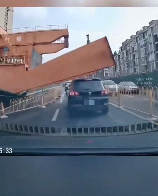 2月1日上午,网友发布了一段行车记录仪拍摄的视频:车辆正常行驶中,左侧有工地,行驶了一段后,车道突然变窄,一辆白车刚经过,空中有大的类似于机械手臂的物件落下来,砸中白色车辆,把后面的黑色车辆给挡住了。